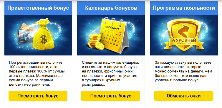 Сразу после регистрации новичок получает уровень Бронзовый и 100 очков лояльности в качестве приветственного подарка. Изначально клиенту начисляют один балл за каждые 10 руб. ставок. По мере накопления очков повышается статус в привилегированной системе.