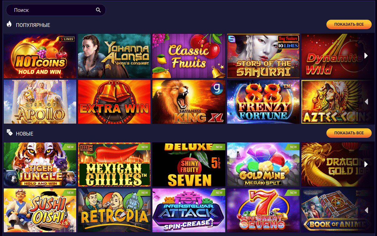 В центральной секции домашней страницы находится список доступных игр с разбивкой по разделам. Там же находится строка поиска, куда пользователь может ввести название любимого игрового автомата.