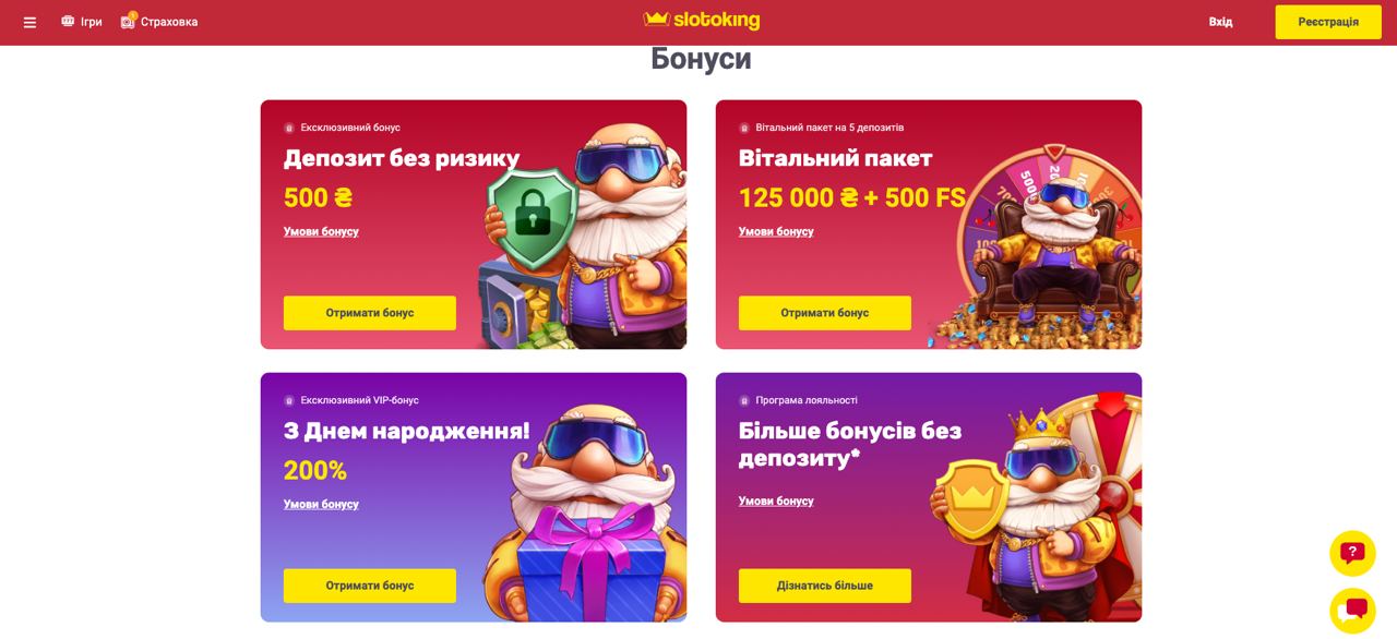 Интерфейс портала по умолчанию на украинском языке, однако, пользователи могут переключиться на качественную русскую версию. В футере площадки игроки найдут описание клуба Слото Кинг, правила и условия, бонусную политику.