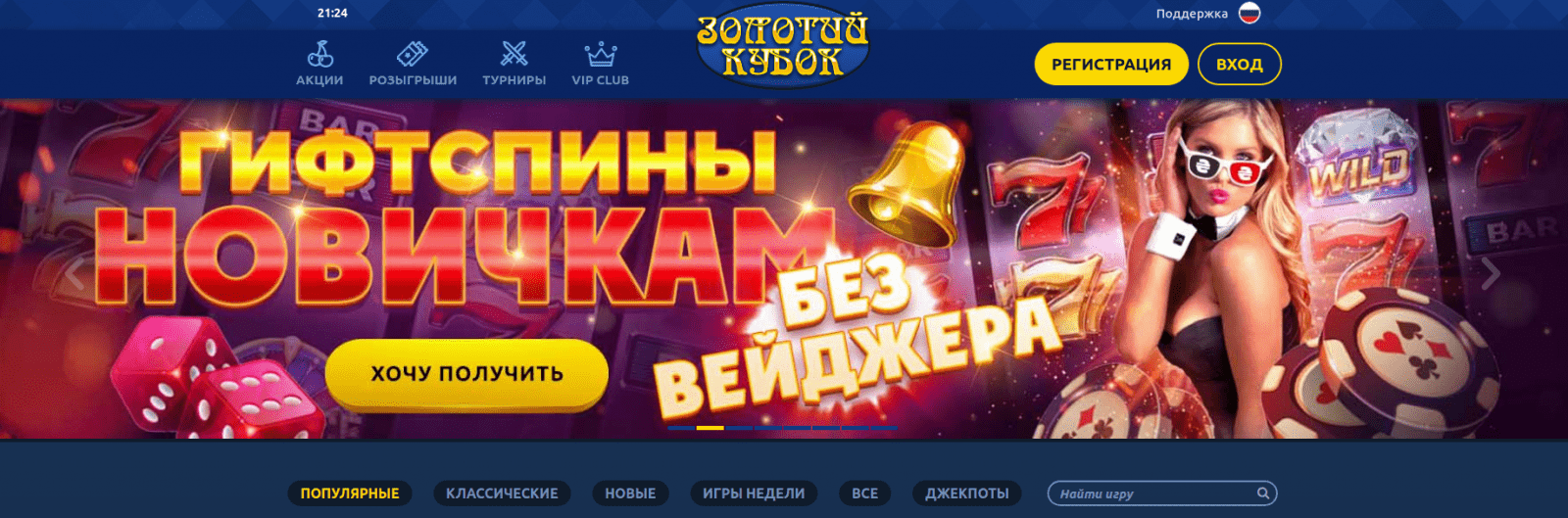 Золотой Кубок понравится тем, для кого в приоритете классические игровые автоматы, бонусы, турниры и розыгрыши, а также оперативный вывод средств и отсутствие обязательной идентификации.