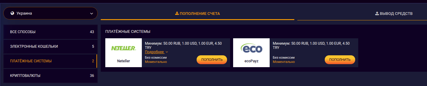 - Валюта для ставок. Пользователям доступен свободный выбор валют и криптовалют для ставок.