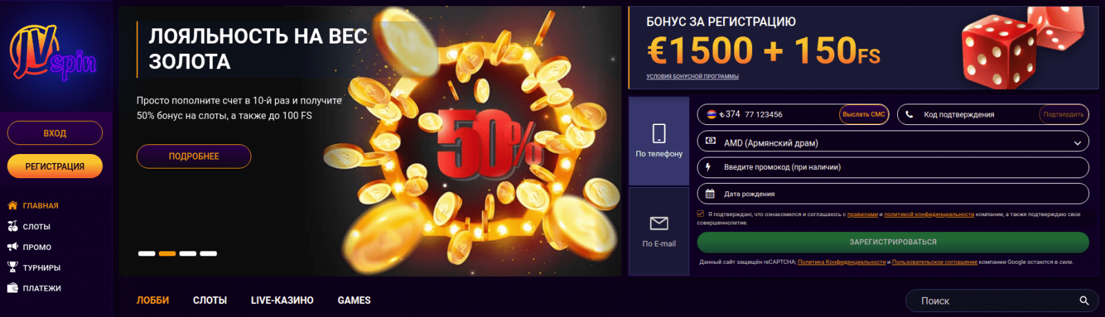 Заходя на JVSpin официальный сайт, потенциального игрока встречает приятное глазу оформление, выполненное в темно-фиолетовых тонах. Дизайн заведения выполнен стильно, с учетом предпочтений современных пользователей. Главное меню грамотно структурировано и позволяет быстро разобраться с навигацией по сайту. Первое, что бросается в глаза на главной странице сайта JVSpin casino – это яркий новостной баннер с информацией о текущих турнирах, бонусных предложениях и акциях. Ниже расположена панель для регистрации учетной записи.