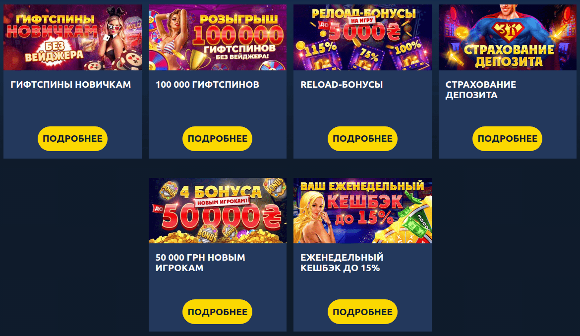 Помимо стартового пакета бонусов, можно участвовать в следующих акциях: