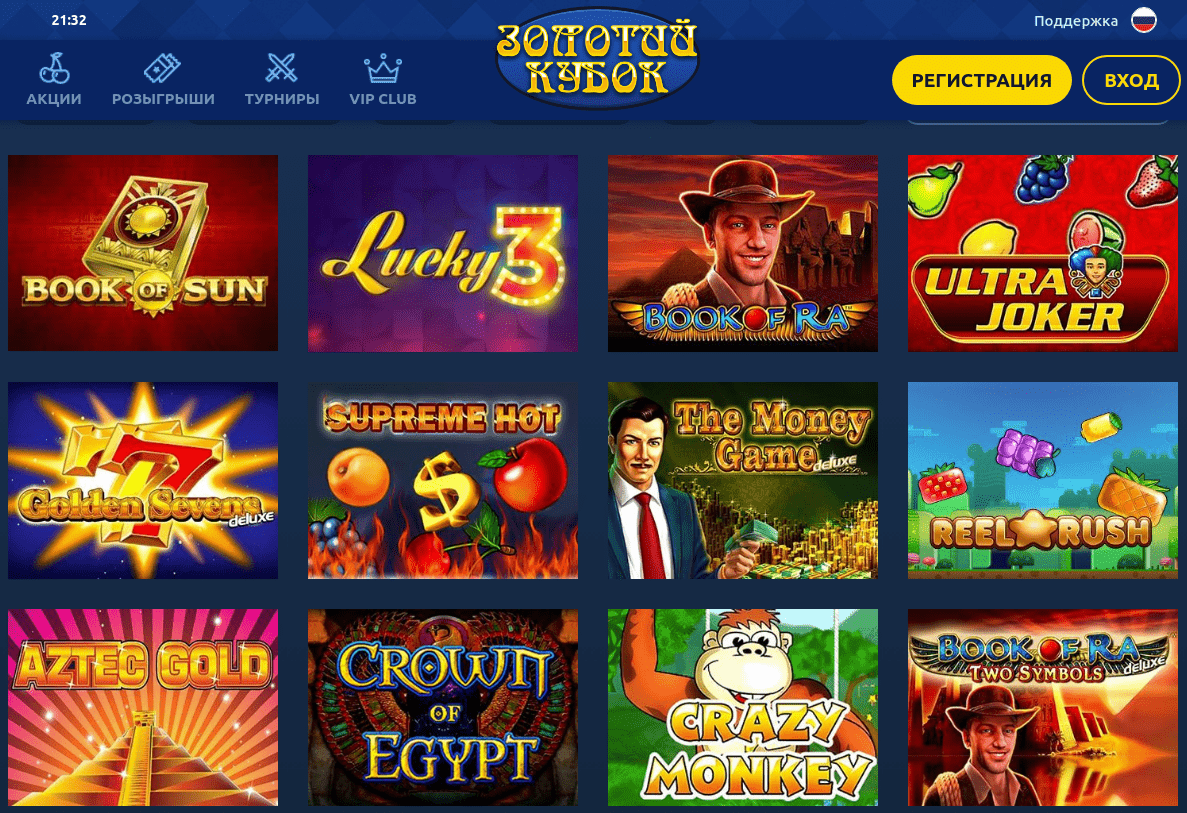 Золотой Кубок понравится тем, для кого в приоритете классические игровые автоматы, бонусы, турниры и розыгрыши, а также оперативный вывод средств и отсутствие обязательной идентификации.