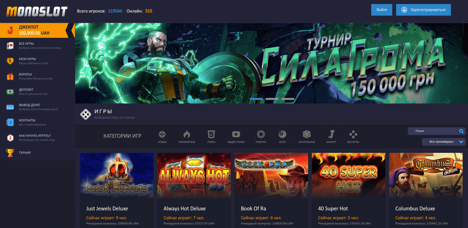 Официальный сайт казино Монослот представлен в удобном и стильном интерфейсе. С ассортиментом игрового зала и доступными опциями сможет быстро разобраться даже новичок. Контент разделен на категории: