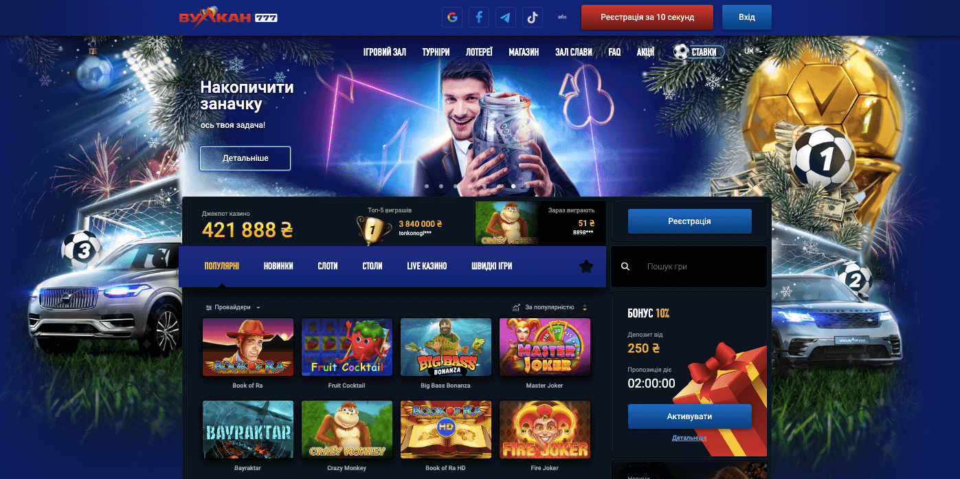 Vulkan – это игровой портал, ориентированный в первую очередь на украинских гемблеров. Он поддерживает UAH как внутреннюю валюту, имеет украиноязычный интерфейс и работает по лицензии, выданной официальным украинским регулятором. Вулкан является домом для 1,000+ игр, среди которых есть классические и современные игровые автоматы, настольные игры, основанные на ГСЧ, а также «живые дилеры». Кроме того, в игровом каталоге казино есть «Быстрые игры», которые предлагают такие же простые правила, как и слоты, но обладают еще более высоким выигрышным потенциалом. Если вы ищете сайт с качественными азартными играми, которому можно доверять, то Вулкан – это то, что вам понравится.